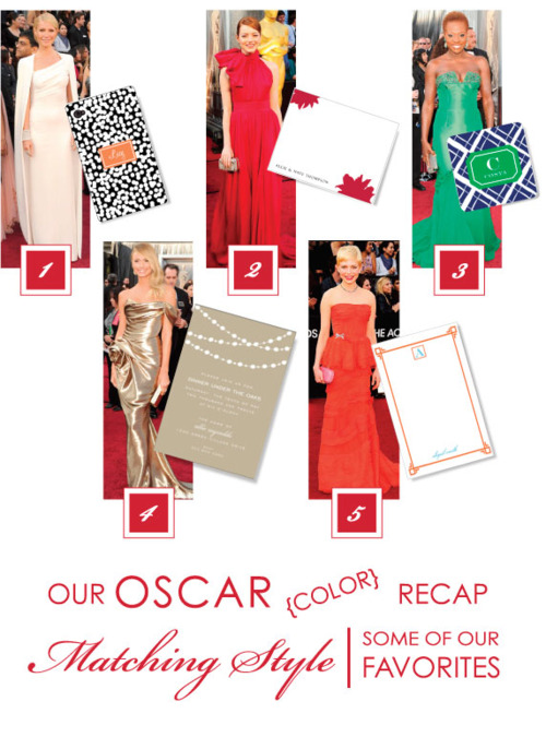 Are you still thinking about the gorgeous-ness from the Oscars? Loving all the color we saw on the red carpet, we decided to have a little mid week fun matching up our top favs from the Oscars with some our most popular products and color schemes.